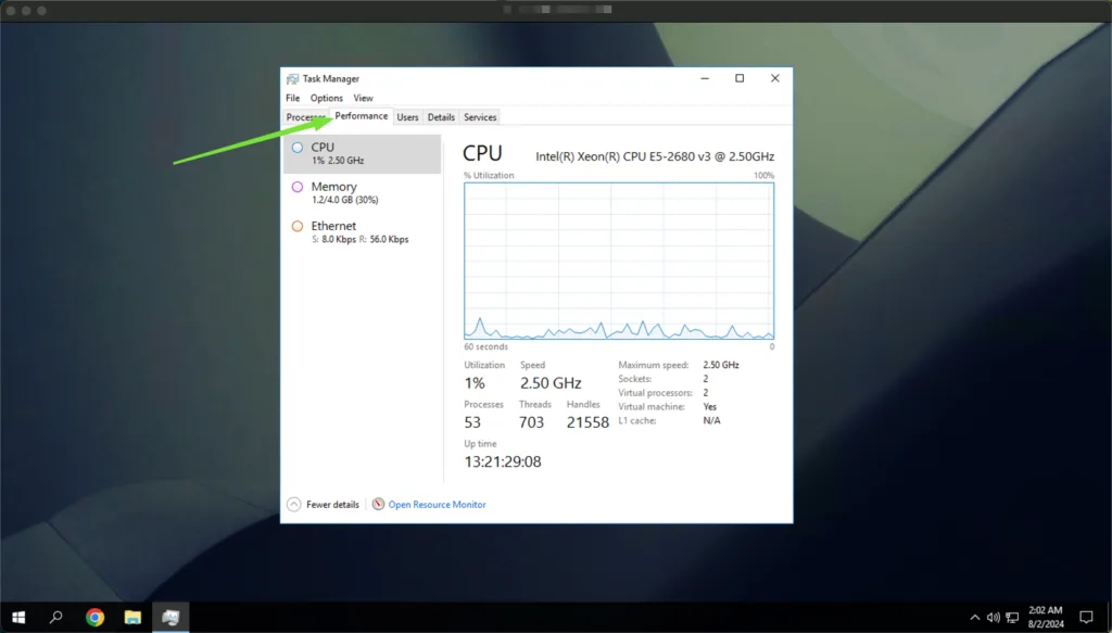 Once Task Manager is open, navigate to the Performance tab. This is where you can observe important information, such as CPU or RAM resources utilization. Click on CPU or RAM tab in the sidebar to see real-time graph and more information about your VPS resources.