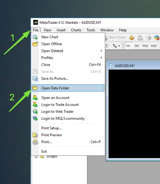 In MT4, go to the File menu at the top-left corner and select Open Data Folder from the dropdown menu to access MT4 data files.