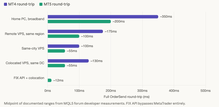 Realistic full round-trip times measured by MQL5 forum developers paint the practical picture. A home PC on broadband produces 200 to 500ms on MT4 and 100 to 300ms on MT5. A remote VPS in the same region runs 100 to 250ms on MT4 and 50 to 150ms on MT5. A colocated VPS in the same data center achieves 60 to 200ms on MT4 and 30 to 80ms on MT5. One user at Equinix NY measured 40ms per trade on MT5. FIX API with colocation bypasses MetaTrader entirely, achieving 5 to 20ms. The critical insight embedded in these numbers: even with sub-1ms network ping, broker server-side processing (bridge, matching, risk checks) adds a minimum of 30 to 60ms for retail MT4/MT5 accounts. The gap between a colocated VPS and FIX API is not about network latency. It is about bypassing MetaTrader’s processing overhead.