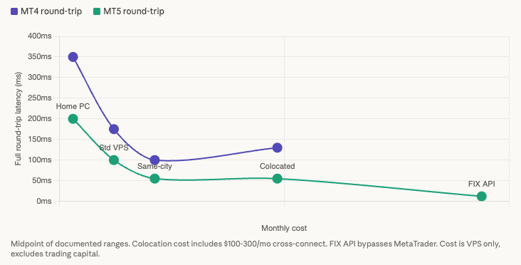 Beyond colocation, the next step is not a better VPS. It is bypassing MetaTrader entirely via FIX API, which achieves 5 to 20ms full round-trip by eliminating the platform processing layer. This requires a broker that offers FIX connectivity (LMAX, some institutional-grade STP brokers), custom software development, and substantially more technical capability than MetaTrader EA deployment. It is a different infrastructure category, not a VPS upgrade.