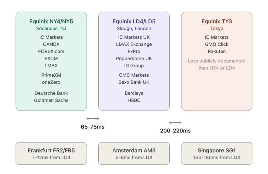 Three Equinix facilities function as gravitational hubs for the majority of retail forex infrastructure.