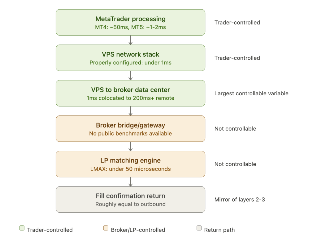 For retail traders, this does not mean chasing microsecond advantages. It means understanding which layers are controllable (VPS location, platform choice, configuration) and which are not (broker bridge processing, LP matching engine speed, last look windows). A trader who moves from a home PC to a colocated VPS eliminates 100 to 200ms of controllable latency. A trader who then switches from MT4 to MT5 eliminates another 48ms of platform processing overhead. Beyond that, further improvement requires bypassing MetaTrader entirely via FIX API, which is a different infrastructure category with different costs.