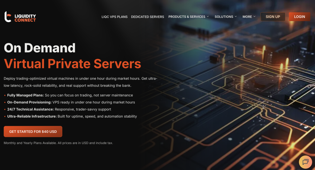 | Liquidity Connect | Low-latency specialist | NY, London, Asia | Yes | ~1–2 ms best-case | Trading SLA | SSD / NVMe | 3–4 terminals | $30/mo |