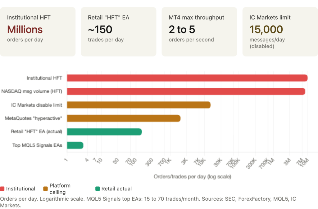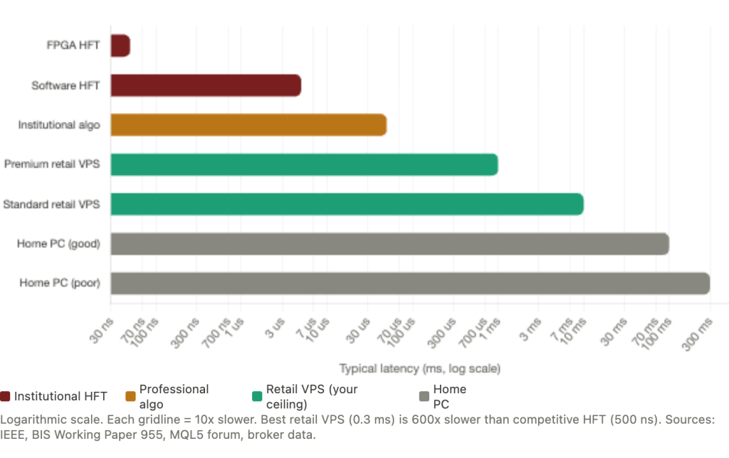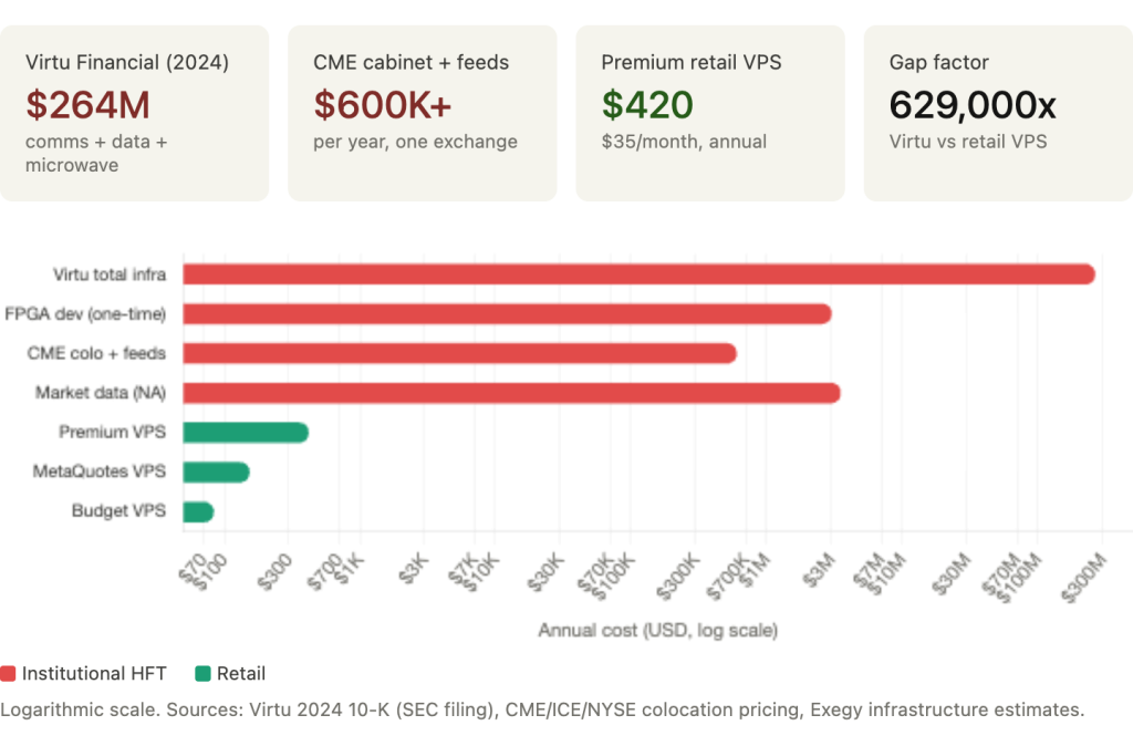 | Infrastructure | Requires co-location, FPGAs, DMA, and multi-million setups. | Runs on standard PCs or VPS via broker APIs. |