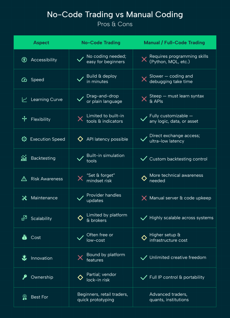 The abstraction that makes no-code easy to use also makes it difficult to troubleshoot when something goes wrong. Users don’t get to see the underlying code that the platform generates. If a trade executes incorrectly, you cannot look through the code line-by-line to find the bug, which is the standard procedure for a developer.