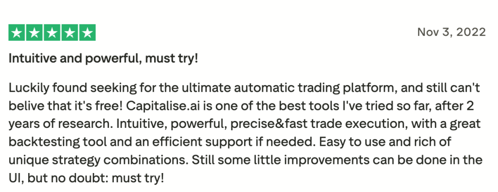 Capitalise.ai is a no-code, natural-language trading automation platform that allows users to write trading strategies in plain English. Capitalize can be used to create trading strategies for different asset classes including stocks, futures, forex, indices, and crypto. The platform was recently acquired by Kraken.