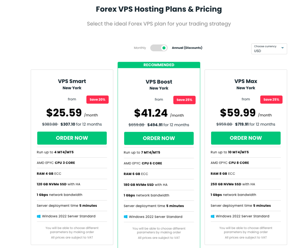 VPSForexTrader is positioned as a cost-effective solution for traders. Their first tier plan (VPS Smart) starts at $31.99/month, but with promotions or annual billing, you can often get it for as low as $19.19/month. This includes: