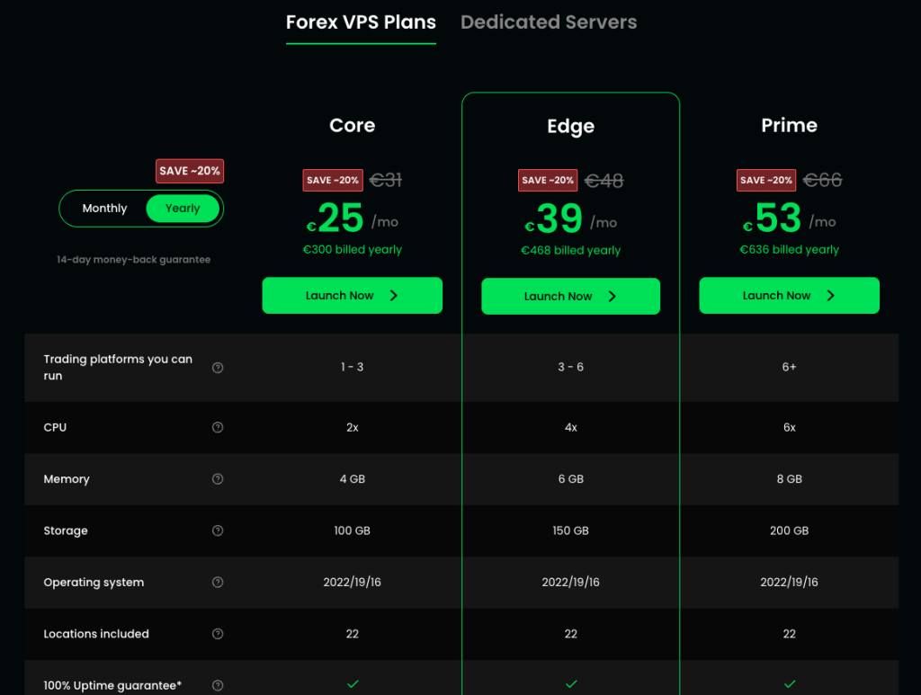 ForexVPS also offers a free VPS option when trading with selected partner brokers, something VPSForexTrader doesn’t provide. However, ForexVPS doesn’t have a low-cost trial like VPSForexTrader, which makes testing less beginner-friendly. Each company offers a 14-day money-back guarantee.