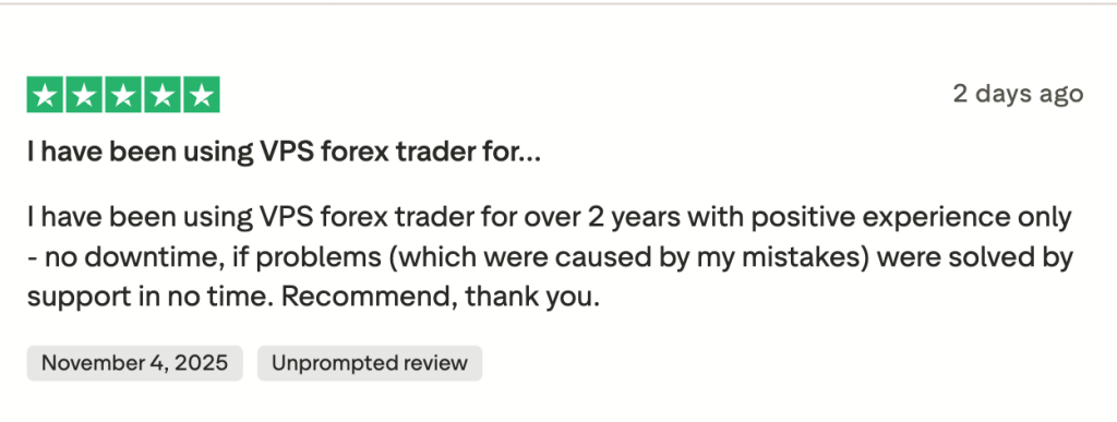 - VPSForexTrader: This service is optimized for lightning-fast trade execution. Their servers are colocated in financial-grade data centers strategically positioned near major forex broker servers, allowing latencies often under 1 millisecond. In practical terms, that means when you place an order via MetaTrader, it reaches your broker almost instantly, minimizing slippage and improving execution speed. VPSForexTrader relies on high-performance AMD EPYC CPUs combined with NVMe SSD storage and a gigabit network infrastructure, delivering consistently fast performance even when running multiple trading platforms. The entire environment is explicitly marketed as “forex-optimized”, meaning the hardware and network resources are specifically tuned for trading workloads rather than generic hosting. User reviews consistently highlight VPSForexTrader’s excellent performance, with many traders mentioning smooth operation even when running multiple MT4 instances simultaneously. You can read more about what users say on our Trustpilot review page.