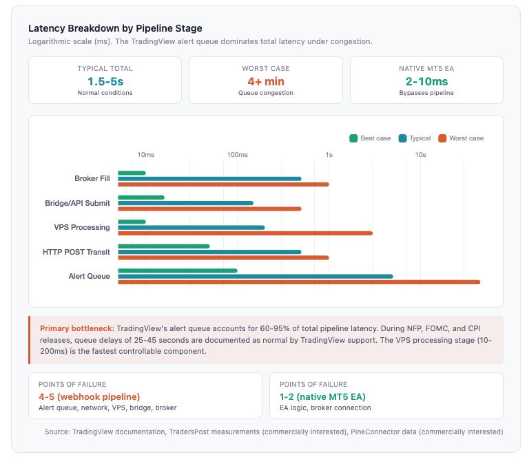 The article is written for traders already using TradingView who want to automate execution through a VPS, and for traders weighing this pipeline against native MetaTrader EAs. If your strategy operates on M1 or M5 timeframes, the latency data in Section 2 will save you the setup time: native MT5 EAs executing in 2 to 10 milliseconds are the better architecture for those use cases.