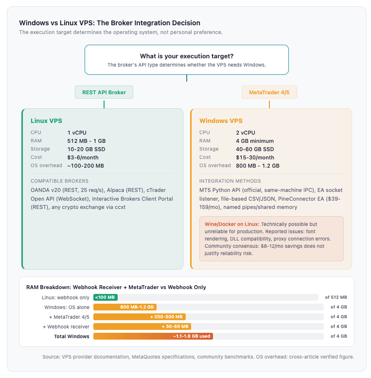 It depends entirely on the broker integration method. If the execution target is a REST API broker (OANDA, Alpaca, cTrader), a Linux VPS at $3 to $6 per month handles the webhook receiver with no Windows dependency. If the execution target is MetaTrader 4 or 5, a Windows VPS at $15 to $30 per month is required because MT4 and MT5 are native Windows applications and the official MT5 Python API is Windows-only. Running MT5 on Linux via Wine or Docker (gmag11/MetaTrader5-Docker) is technically possible but unreliable in production, with reported issues including font rendering failures, DLL compatibility problems, and proxy connection errors. Community consensus is that the $8 to $12 monthly savings from Linux does not justify the reliability risk for MetaTrader workloads.
