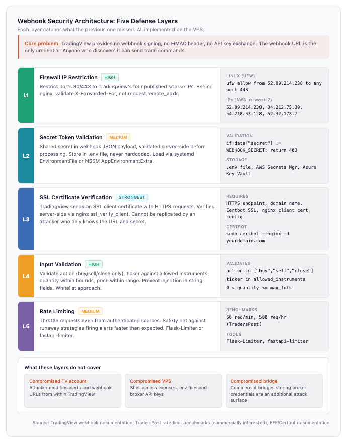 Layer 3: TradingView SSL certificate verification. When the webhook URL uses HTTPS, TradingView sends an SSL client certificate with each request. This certificate can be verified server-side to confirm that the request originated from TradingView’s infrastructure. It is the strongest authentication mechanism available for this pipeline because it cannot be replicated by an attacker who merely knows the webhook URL and the shared secret. Implementing client certificate verification requires configuring nginx to request and validate the client certificate against TradingView’s certificate chain. This is more complex than the first two layers and not documented in most webhook tutorials, but for high-value accounts it closes the gap between “shared secret that could be leaked” and “cryptographic proof of origin.”
