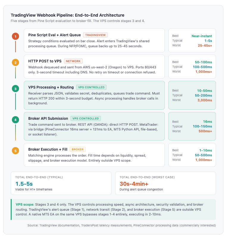A TradingView webhook trade passes through five stages before it becomes a filled order. Each stage adds latency, and each is a potential failure point. The VPS sits in the middle, controlling two of the five stages. The other three belong to TradingView’s infrastructure and the broker’s execution stack.