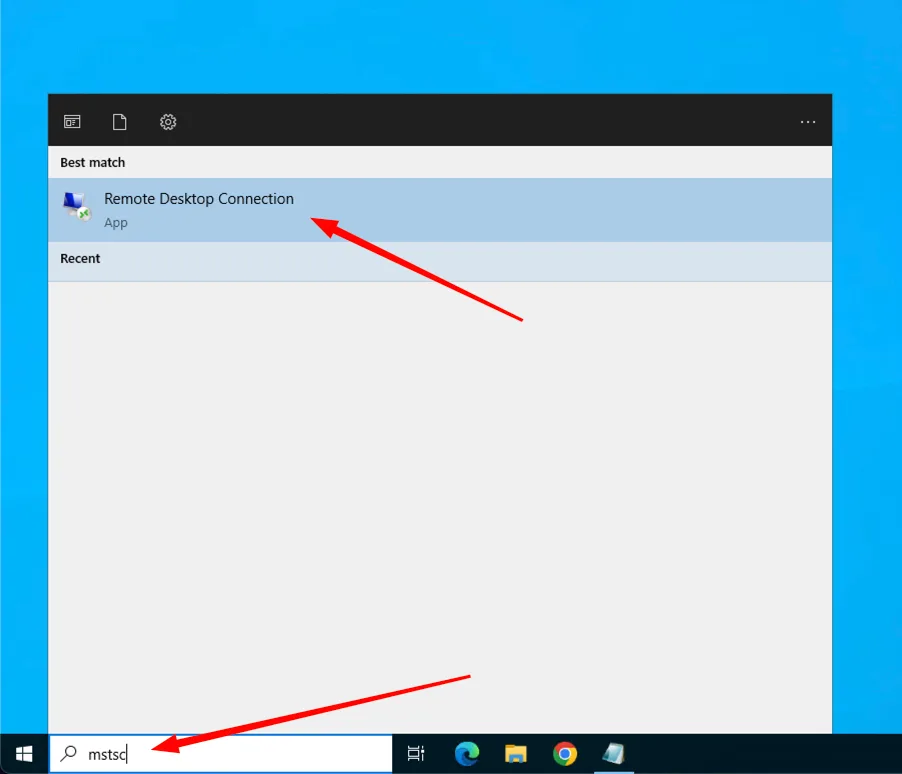 Open Windows Search (or click Win+S), type mstsc and open Remote Desktop Connection.