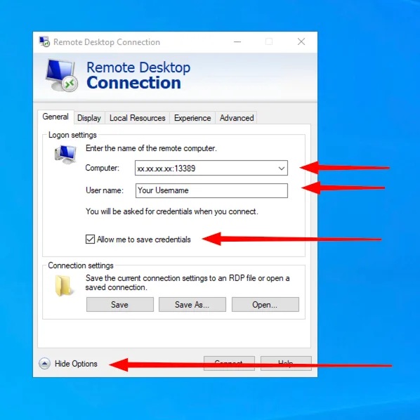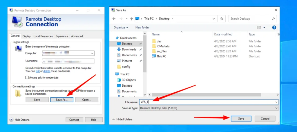 You can easily save your filled in details to .rdp file for easier access in the future.