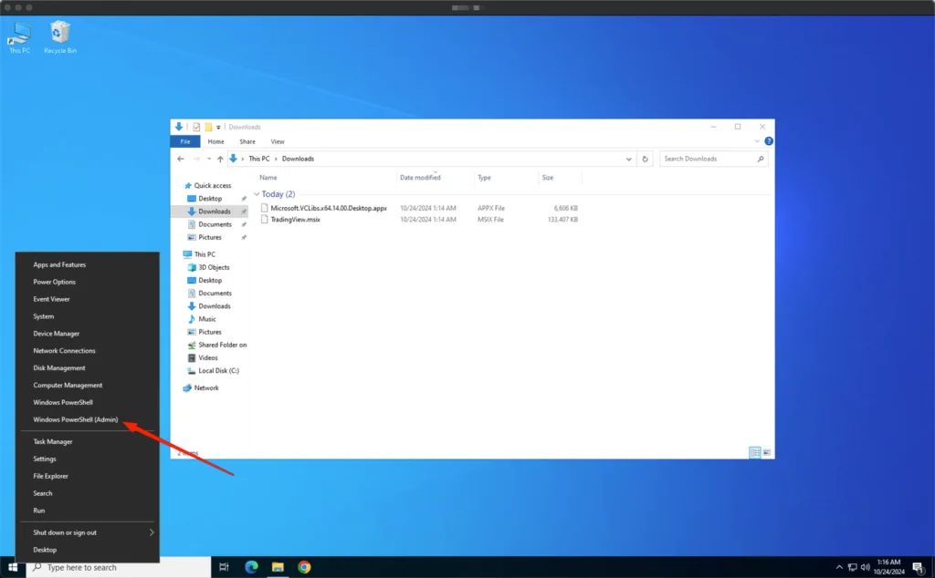 Right-click the Start icon at the bottom-left of your screen and choose Windows PowerShell (Admin). This will open a new terminal window.