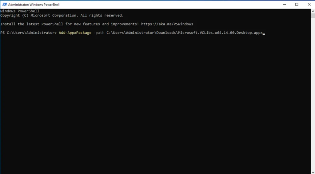 Add-AppxPackage -path C:\Users\Administrator\Downloads\Microsoft.VCLibs.x64.14.00.Desktop.appx