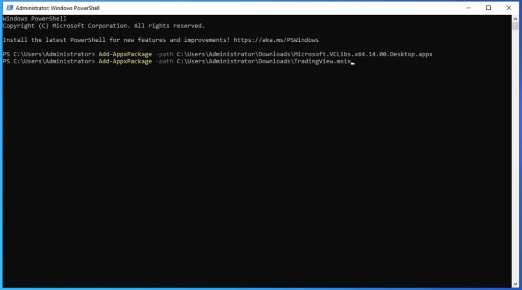 Add-AppxPackage -path C:\Users\Administrator\Downloads\TradingView.msix